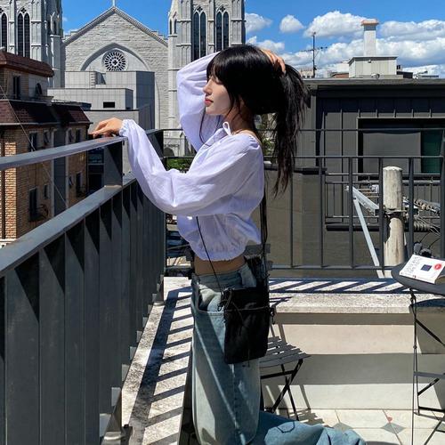 [옷자락]여자 어깨 트임 스트랩 밴딩 크롭 블라우스