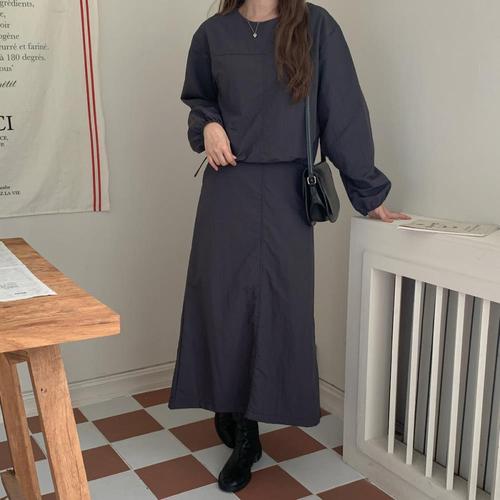 [옷자락]여자 빈티지 나일론 블라우스 밴딩 롱스커트 세트