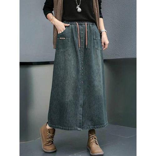2025 새로운 패션 모조 데님 H 라인 하이 웨스트 스커트 봄 여름 느슨한 솔리드 컬러 포켓 맥시 스커트 여성을위한