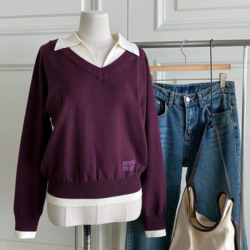여성 슬릿 카라넥 레이어드 긴팔 니트티 DGB-WKN-4731-버건디