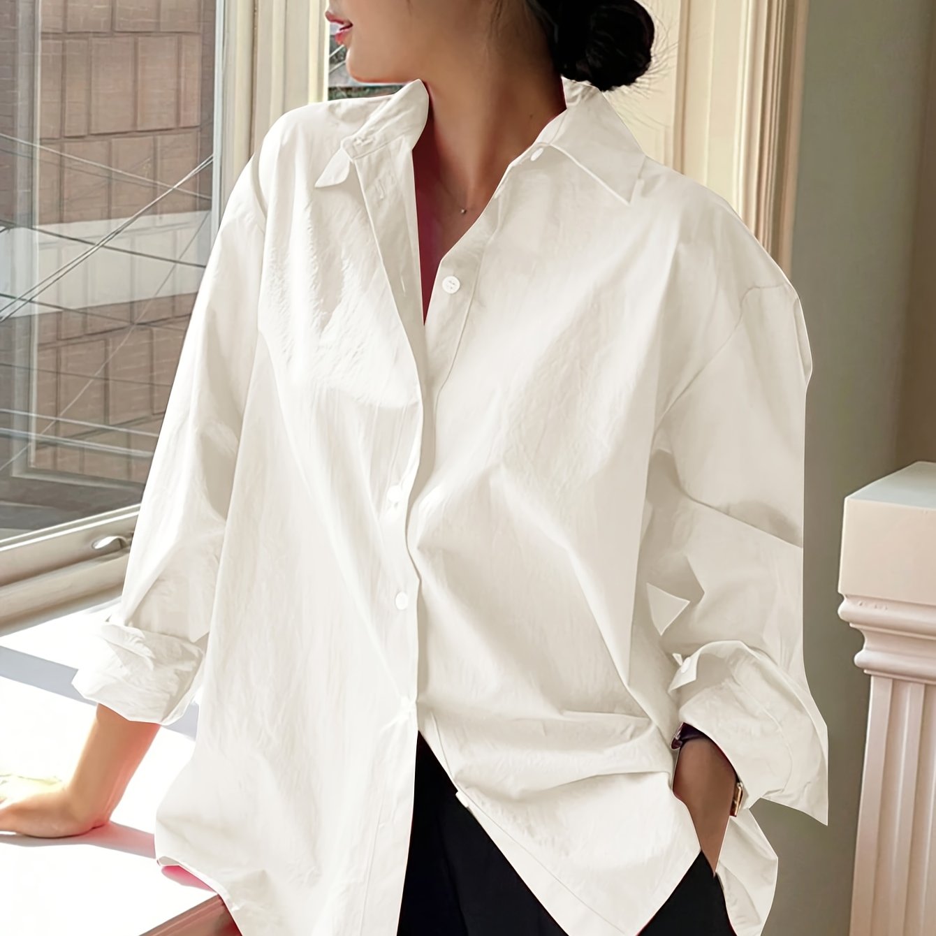 TEMU 솔리드 컬러 버튼셔츠 - 루즈핏 드롭 숄더 롱슬리브 블라우스, 솔리드 컬러 버튼프론트 플라켓, 캐주얼 & 프로페셔널 웨어를 위한 봄/가을 필수 아이템, 세탁기 사용 가능한 논스트레치 셔츠