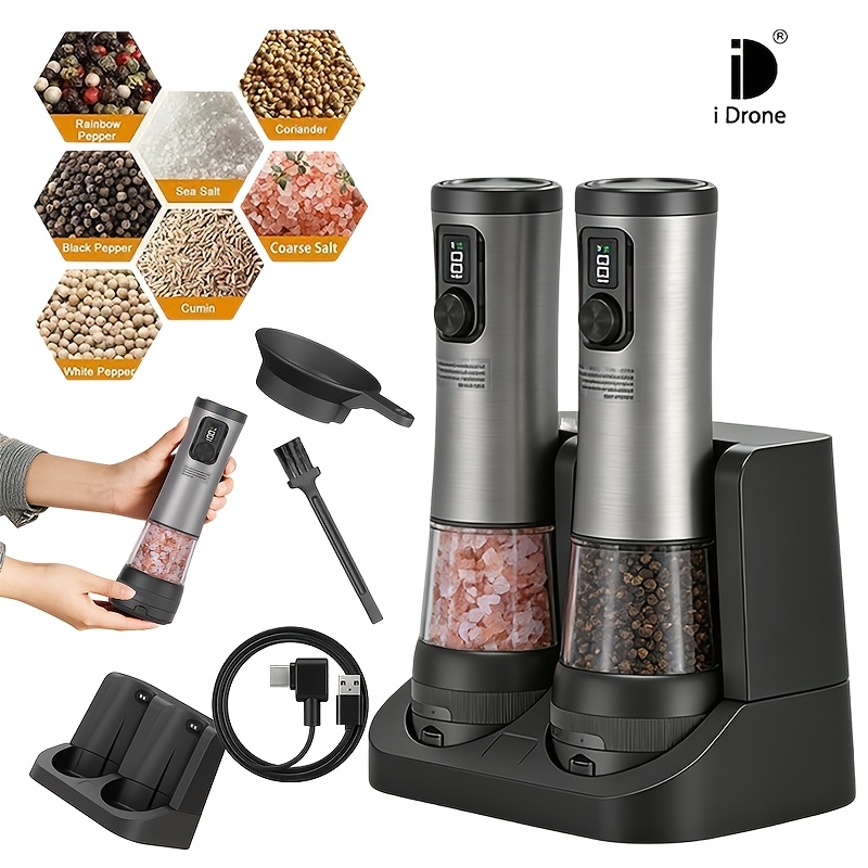 TEMU 전기 소금/후추 그라인더 세트 - 배터리 잔량 표시 기능이 있는 자동 후추 분쇄기, 5단계 조절 가능, 먼지 덮개 및 받침대 포함, 현대적인 주방 가전 제품에 적합 | 크리스마스 | 할로윈