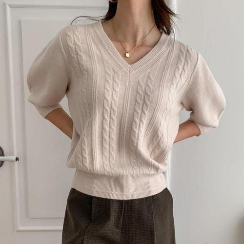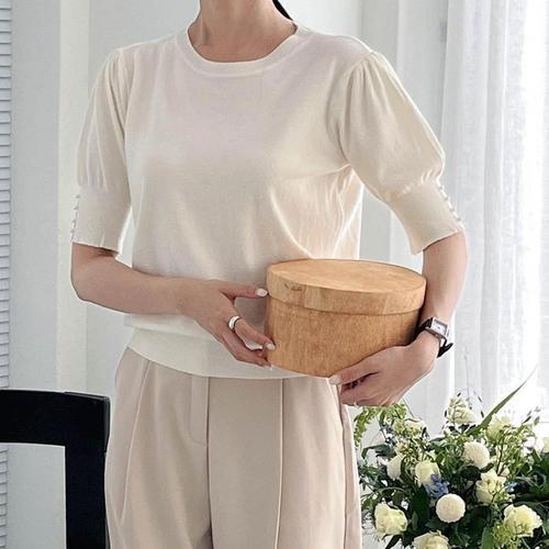 여성 여름 반팔 벌룬 크롭 단가라 퍼프 니트 티셔츠
