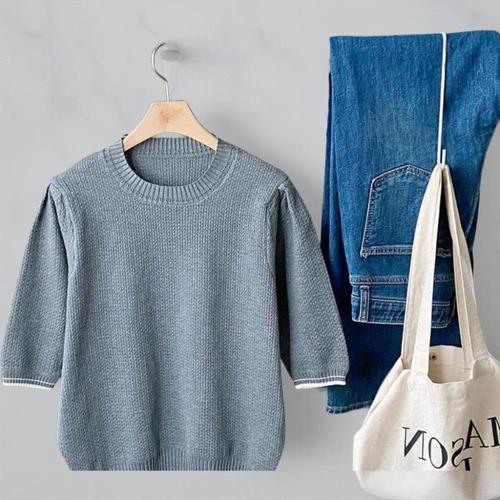 여성 반소매 벌룬 와플 U넥 레이온 조직 니트