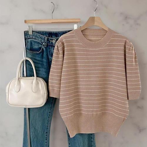 여성 반소매 핀턱 벌룬 캐쥬얼 줄무늬 니트