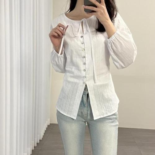 [다잇템][다잇템] 여자 면원단 슬림핏 여성스러운 리본 벌룬 잔단추 블라우스_23606195_588872