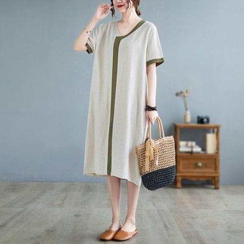 봄 여름 리넨 5분 소매 세련 연상적 패션 원피스 여성용 캐주얼 V넥 얇은 소매 긴 원피스 스타일 더위 흡수