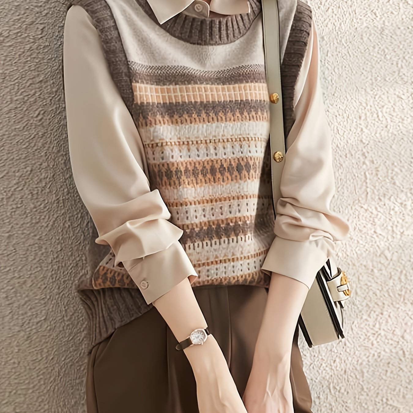TEMU 여성을 위한 빈티지 프렌치 스타일의 우아한 스웨터 풀오버. 캐주얼 데일리룩에 레이어링하기 완벽하며, 가을/겨울 시즌을 위한 패턴 조끼가 특징입니다.