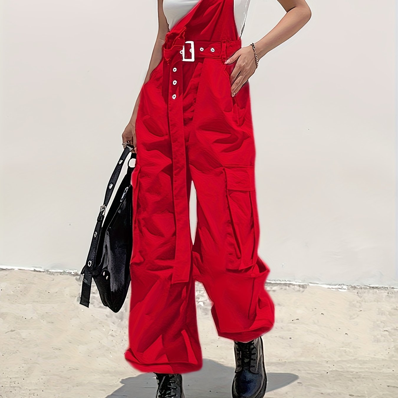 TEMU 여성용 패션 파티 카고 팬츠 - 벨트 포켓 & 멜빵 포함