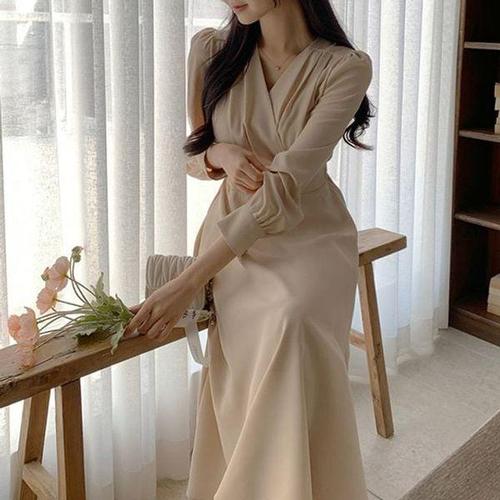 [에이치플러스몰]여성 베이지 브이넥 롱 원피스 오피스 하객룩