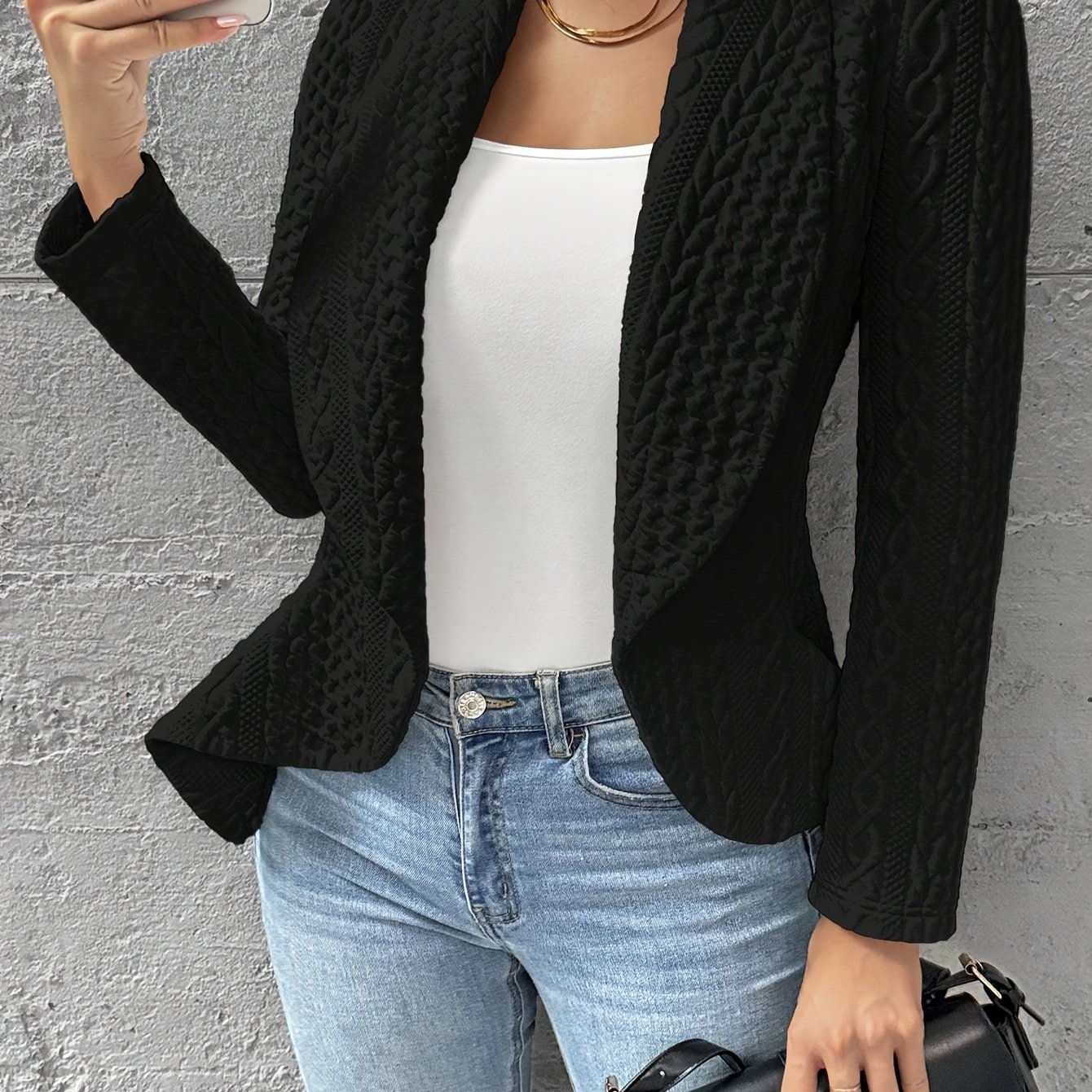 TEMU 여성용 우아한 긴팔 재킷 - 오픈 프론트, 솔리드 블랙, 캐주얼 또는 사무복 착용을 위한 스타일리시 아우터웨어, 가벼운 폴리에스터, 세탁기 사용 가능, 사무실 재킷 | 세련된 질감 | 스타일리시한 캐주얼 웨어