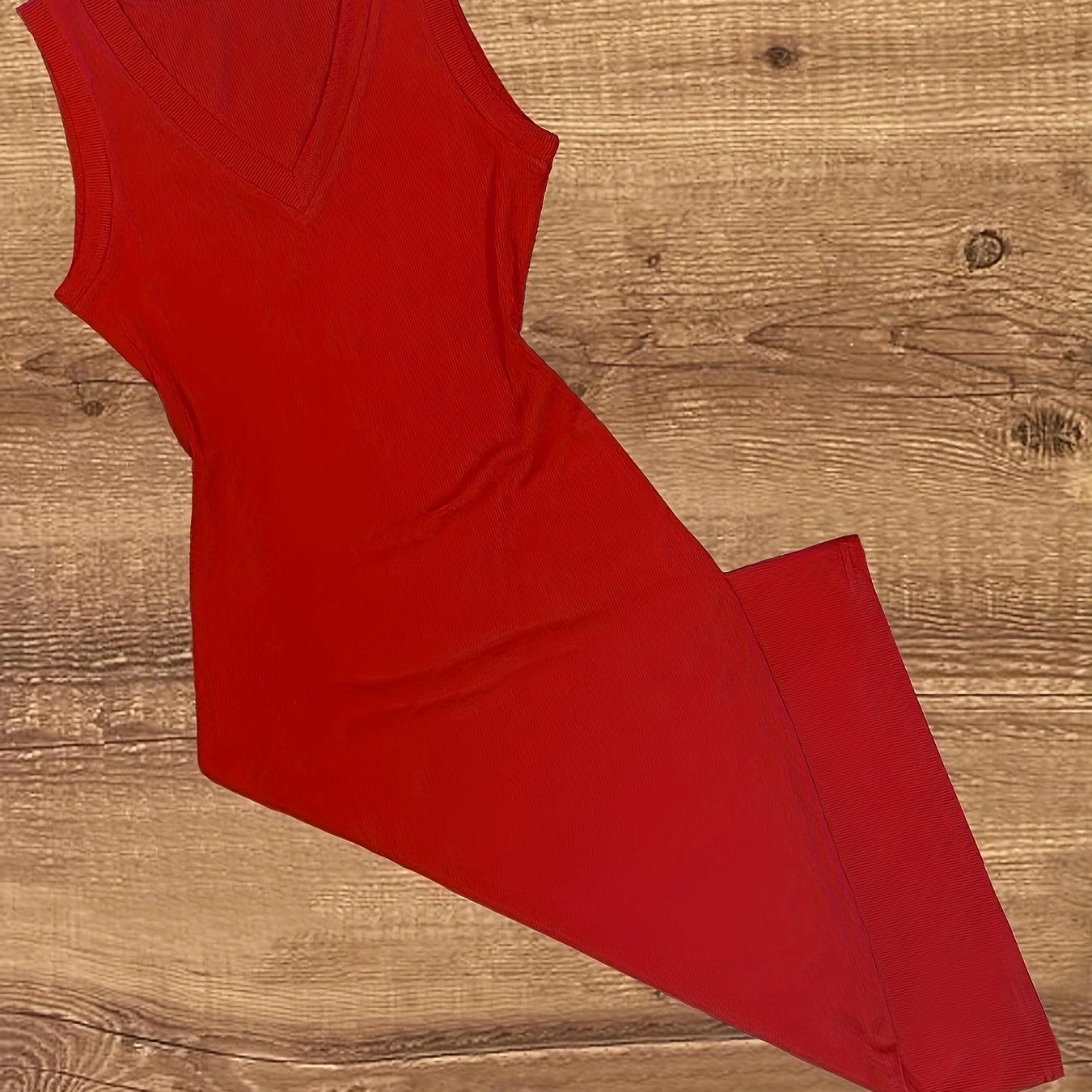 TEMU 여성용 우아한 빈티지 V넥 바디콘 드레스 - 레드 단색 민소매 미디 길이 파티 & 데일리 포멀룩, 세탁기 사용 가능, 올 시즌 시크 이브닝 가운, 귀여운 드레스