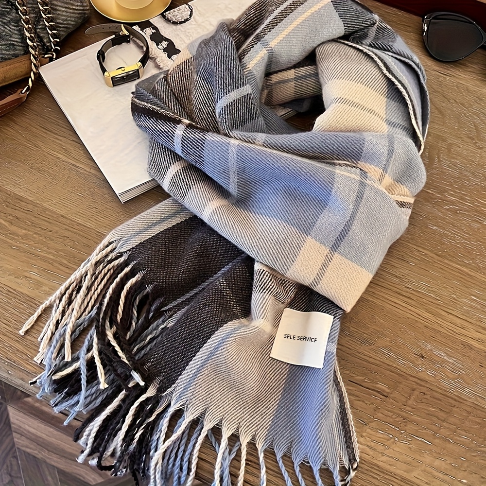 TEMU 여성용 클래식 레트로 체크 스카프 - 멀티컬러 타탄 숄 & 프린지 겨울 목도리, 부드러운 베이지/브라운/그레이/블루/그린 태슬, 캐주얼 & 포멀 의상에 어울리는 우아한 체크 숄, 손세탁 가능한 비탄성 보온 액세서리