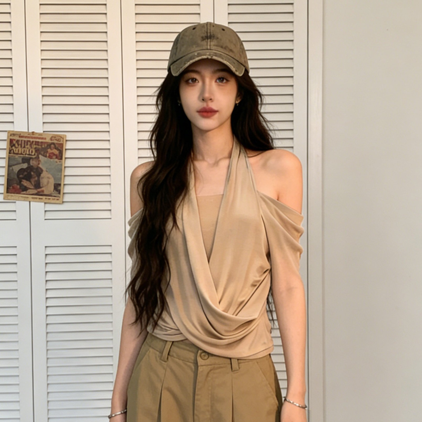 TEMU 팅윤 여성용 우아한 오프숄더 리브드 탑 & 비대칭 밑단 - 베이지 슬림핏 스트레치 티셔츠, 봄/여름 패션, 독특한 숄더 디자인, 편안한 착용감, 세탁기 사용 가능