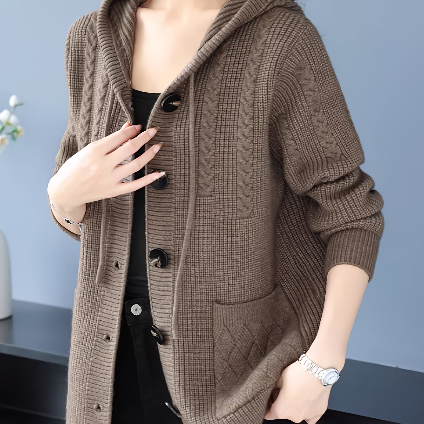 TEMU 여성용 케이블 카디건 긴팔 후드 버튼 프론트 스웨터 - 중간 스트레치 단색 가을 겨울 캐주얼 시크 아우터웨어, 후드 넥라인, 편안한 핏|가디건