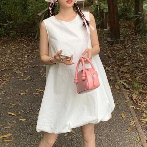 [에이치플러스몰]라운드넥 민소매 데일리 밑단 미니원피스 클래식 볼륨