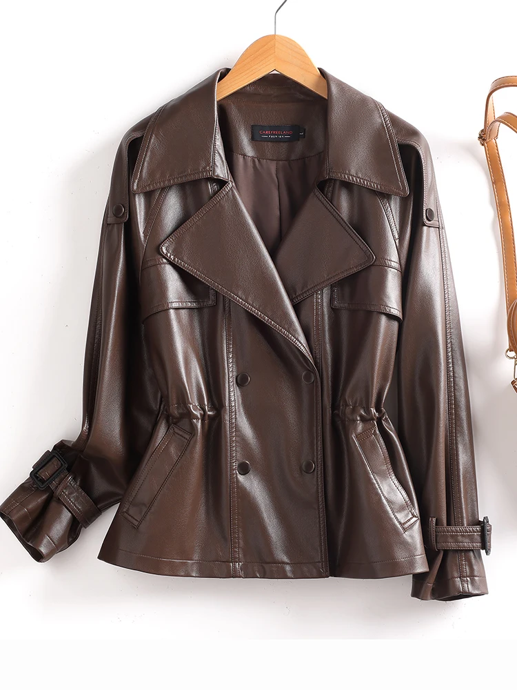여성용 정품 양가죽 가죽 재킷 짧은 코트 끈 조임 허리 슬림핏 봄과 가을용