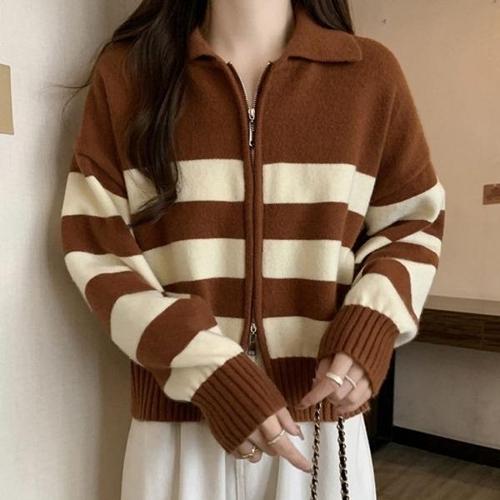 [엄지척]브라운 큰스트라이트 패턴 집업 여자 가디건 봄자켓_19804430_667501