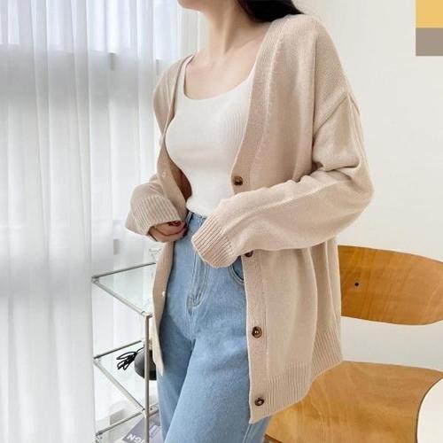 여자니트가디건 여자 주말 외출 봄 코디 라운드 넥 버튼 가디건 룩