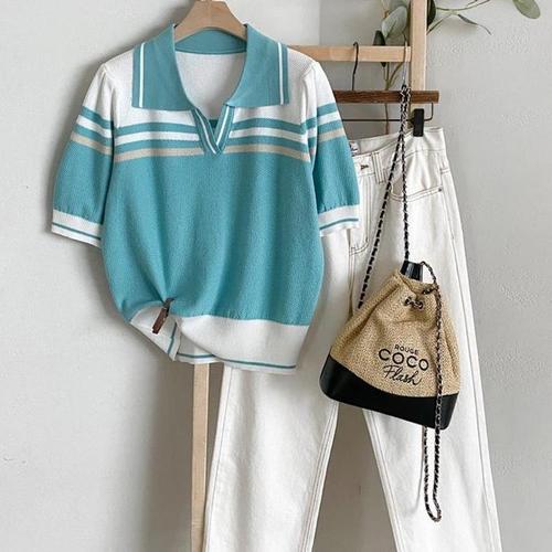 [신상오픈런]오픈넥 스트라이프 카라 시보리 반팔니트 봄티셔츠 (31605926)