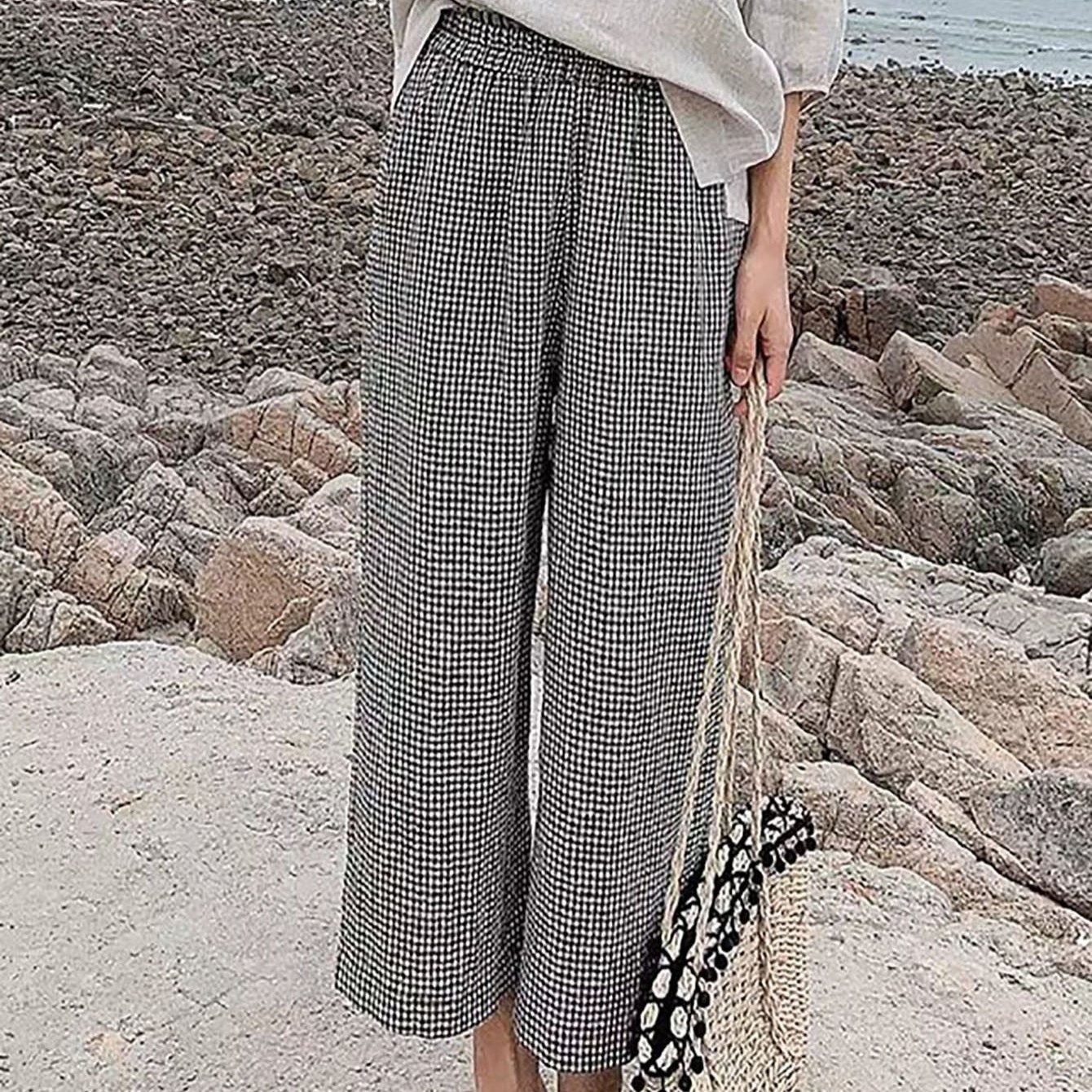 TEMU 여성 여름 데일리 패션 하이웨스트 밴딩 얇은 통기성 체크 9부 슬랙스 바지 캐주얼 컴포트 와이드 팬츠 슬림소녀 SLIM GIRL