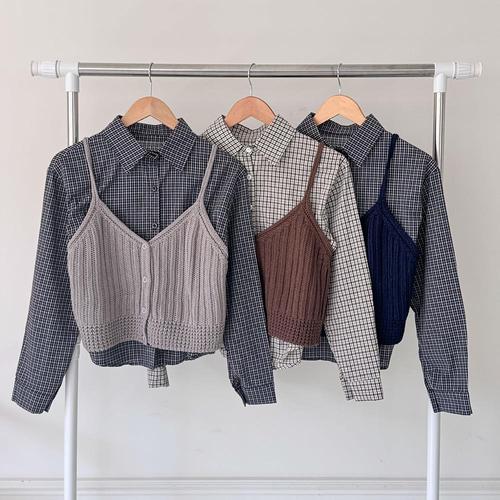 [옷자락]여성 체크셔츠 레이어드 니트 뷔스티에 세트