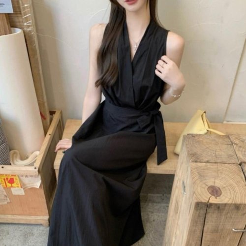 [옷자락]여성 랩형 V넥 민소매 롱 원피스 허리끈 포함