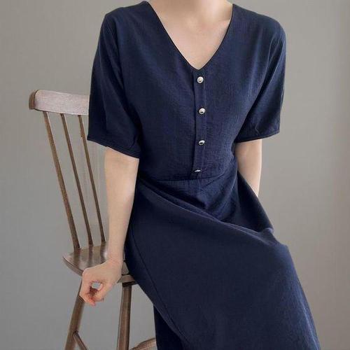 [신상오픈런]여성 여름 하객 원피스 브이넥 버튼 뒷리본 빅사이즈 롱드레스
