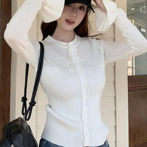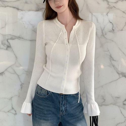 [신상오픈런]여성 슬림핏 브이넥 펀칭 프릴 소매 니트 가디건