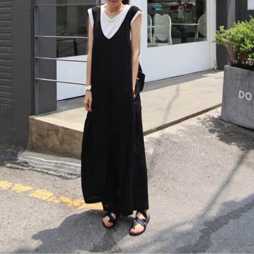 [에이치플러스몰]점프수트 민소매 루즈핏 브이넥 레이어드 여자 편한