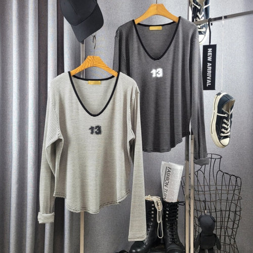 씨샵인더룸 / 블랙라벨 13 스트라이프 라운드 밑단 브이넥 긴팔 티셔츠 2color