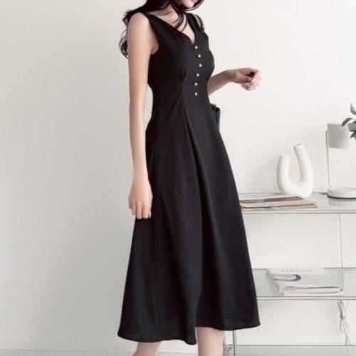 여성용 진주버튼 블랙 브이넥 민소매 롱 드레스