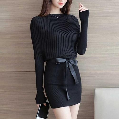 [룽스]미니원피스 느낌 허리 매듭 끈 올블랙 긴팔 원피스
