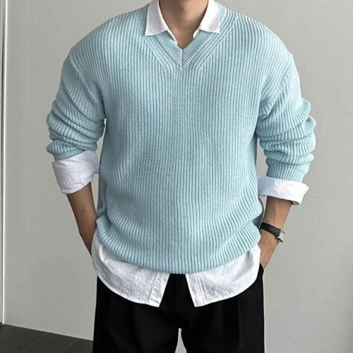 남성용 브이넥 스카이블루 니트 어깨라인 강조 니트웨어 WFLMFLL