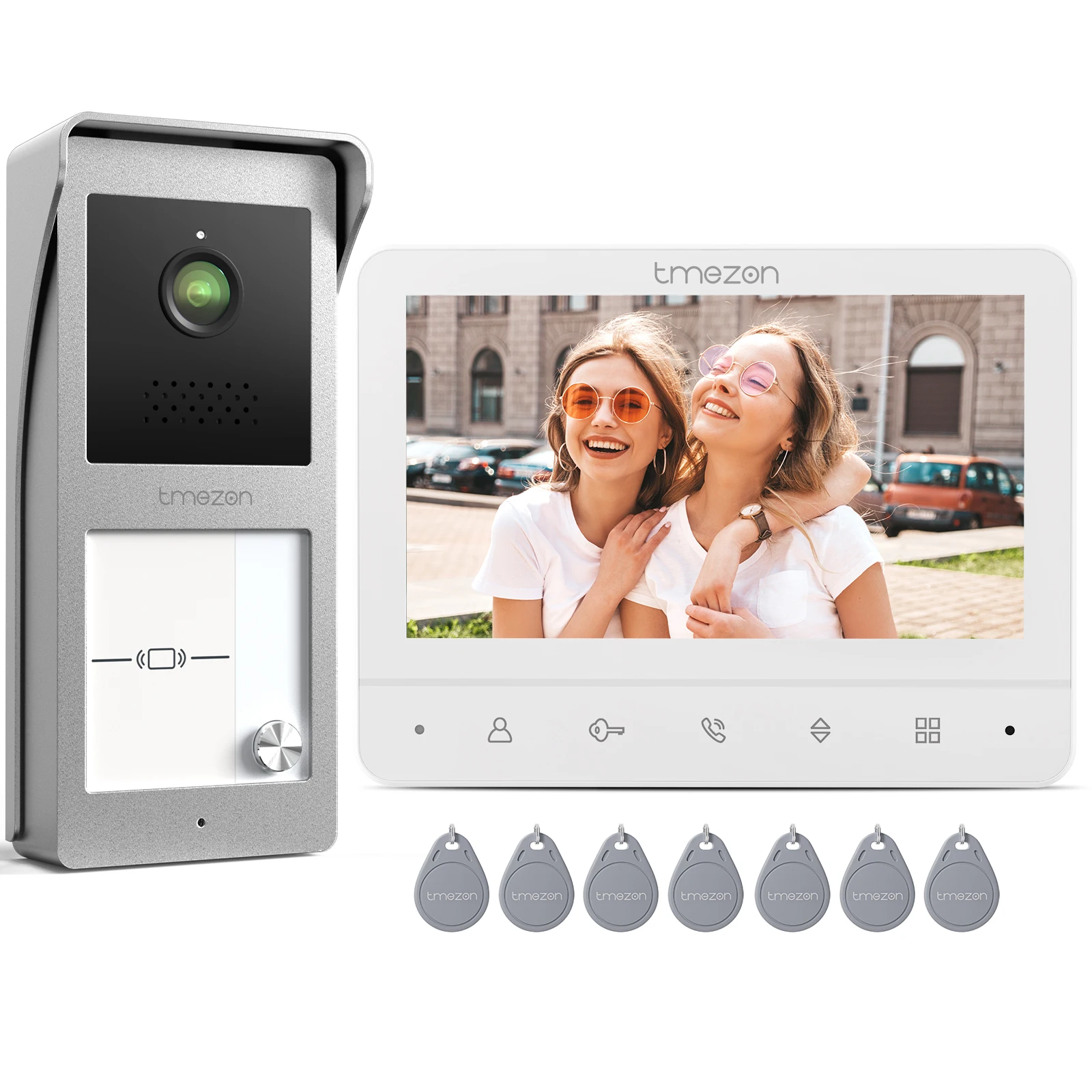가정용 4선 비디오 도어폰 초인종 인터콤 시스템, 매장용 유선 벨이 있는 TMEZON 7인치 모니터, 카드 스와이프 잠금 해제