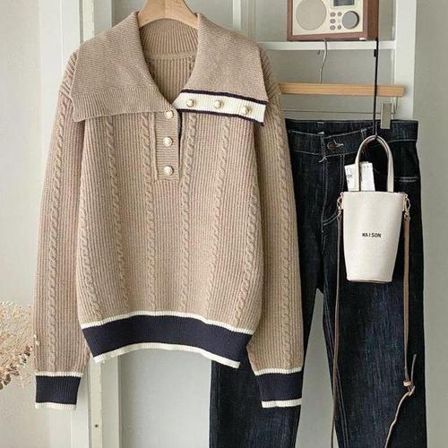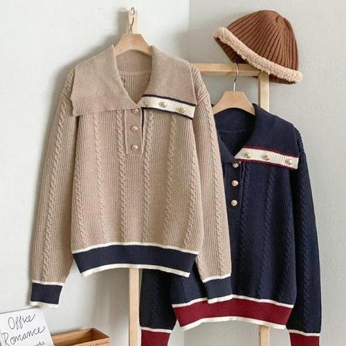 [신상오픈런]여성 비스코스 컬러 블록 세일러 카라 버튼 니트