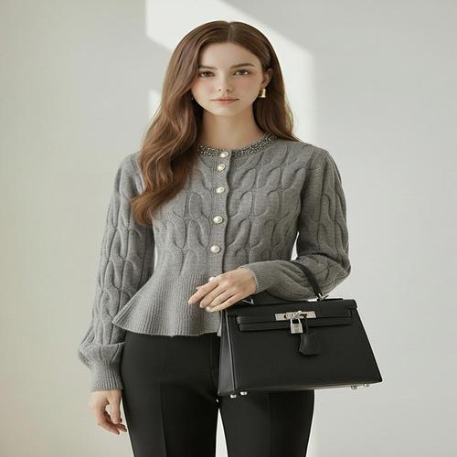 해피유통 여성 봄가을 패션 가디건 니트 비즈 장식 짧은 아우터bhf