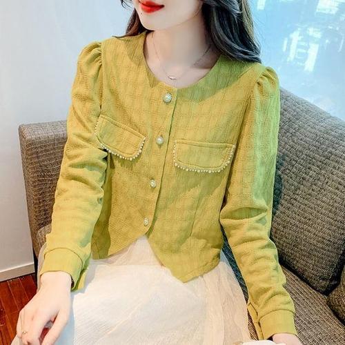 [옷자락]여자 봄 가을 페미닌 옐로우 비즈 단추 울 가디건