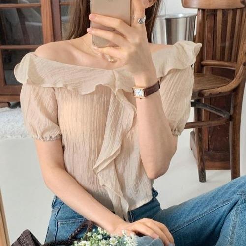 [다잇템][다잇템] 여자 벌룬반팔 비침 프릴 볼드숄더 프릴넥 블라우스_21262897_588872