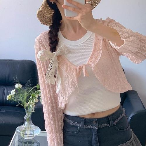 [다잇템][다잇템] 여자 프릴 비침 꽃무늬 리본 숏가디건 엷은 가디건_21262893_588872