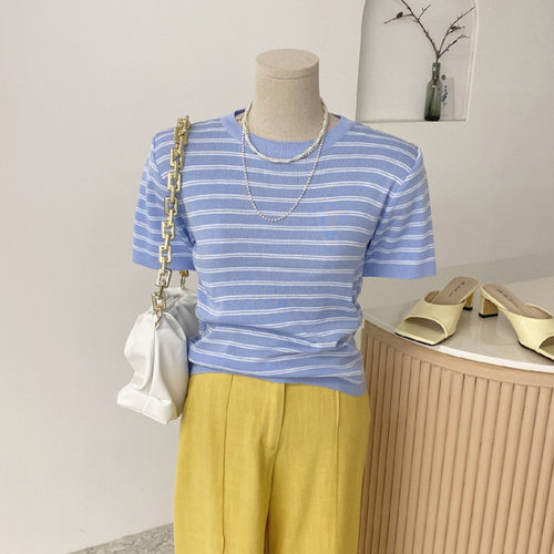 허니제이 / 포포빅 두줄 스트라이프 라운드 반팔 니트