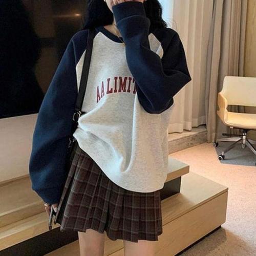 150kg까지 빅사이즈 1+1 여성 빈티지 나그랑 프린팅 긴팔티 티셔츠 봄 여름 신상 편한 라운드 영문티 배색 이어붙이다 루즈핏 박스티 날씬해보이는 캐주얼 패션 기본티 풀오버