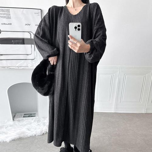 [에이치플러스몰]골지 브이넥 니트 빅사이즈 롱 원피스