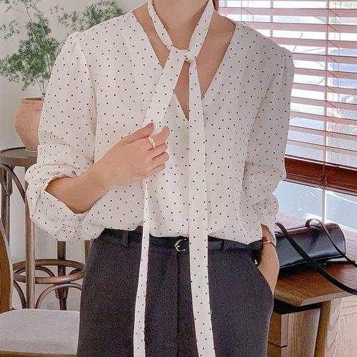 [옷자락] 여자 롱타이 브이넥 도트 빅사이즈 여리핏 블라우스