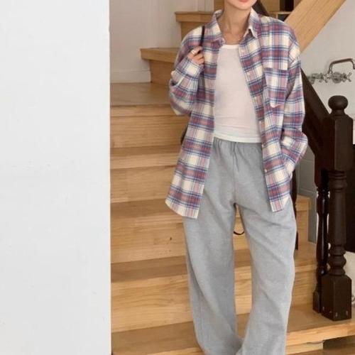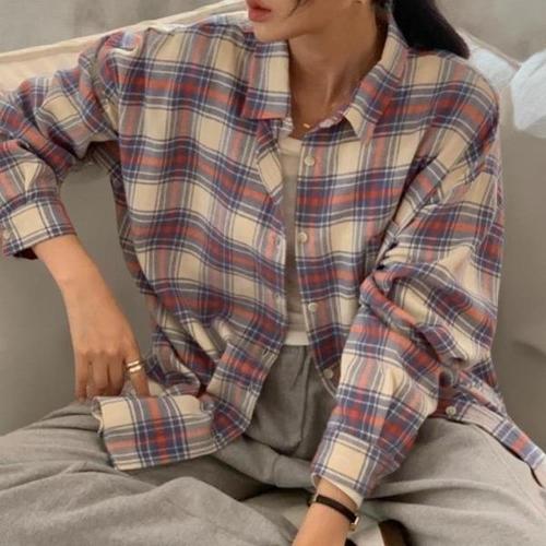 봄 여성 체크 긴팔 셔츠 심플 베이직 롱 셔츠 데일리 루즈핏 카라 블라우스 캐주얼 남방 상의 외투 빅사이즈