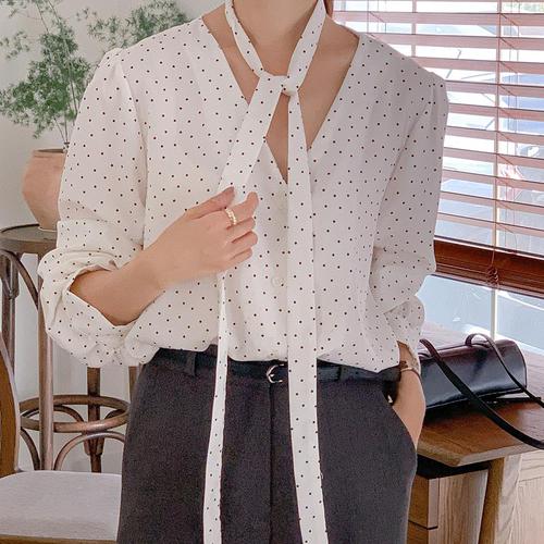 [옷자락]여자 롱타이 브이넥 도트 빅사이즈 여리핏 블라우스