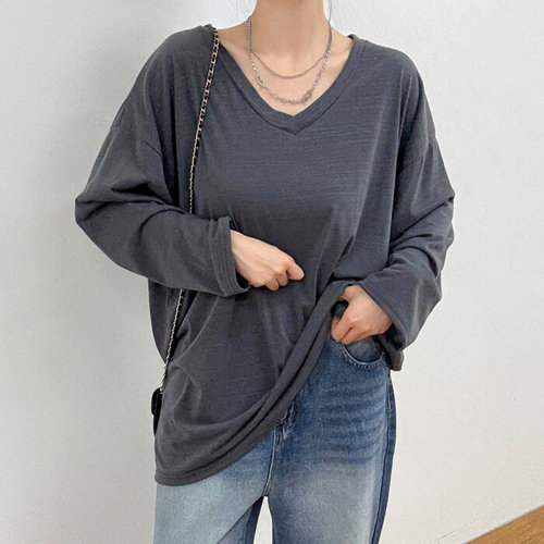 나야홍 / 빅사이즈 509 브이롱슬리브박시티셔츠 DBAV327