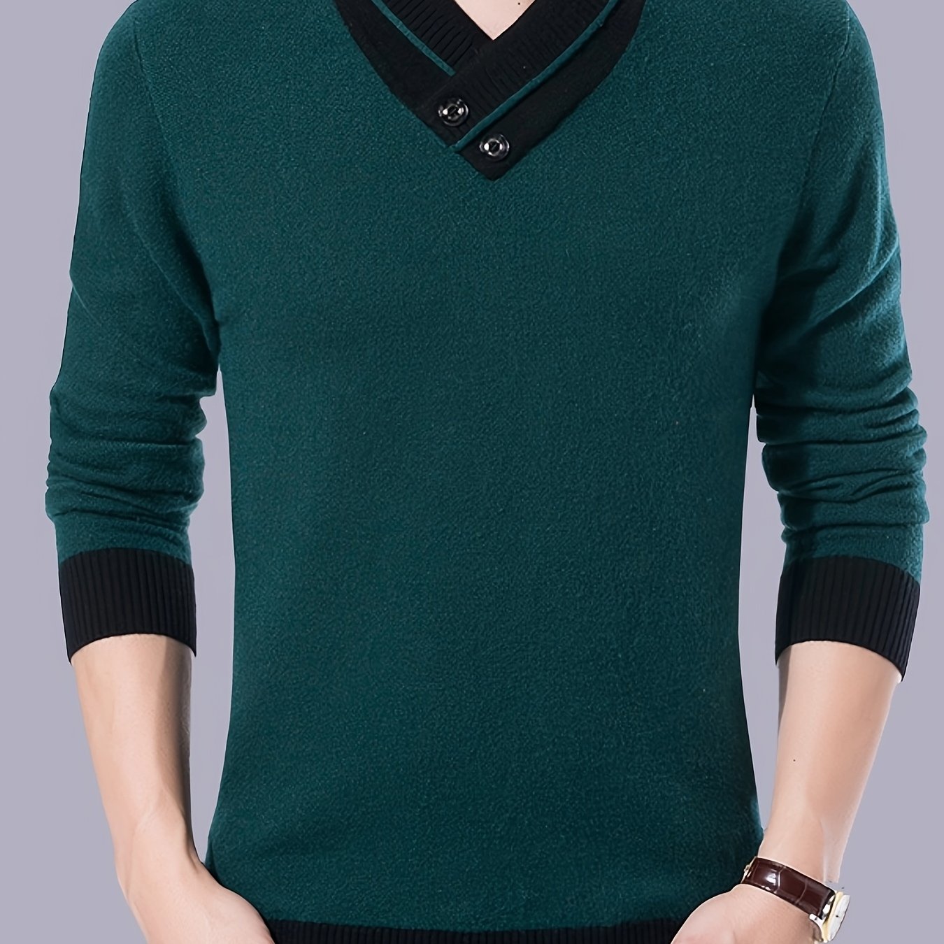 TEMU 남성용 캐주얼 V넥 스웨터 - 두꺼운 겨울용 따뜻한 풀오버, 대비 칼라, 다크 그린 & 블랙 디자인, 고신축성 기계세탁 가능 원단, 레귤러 핏 슬리브, 리브 디테일