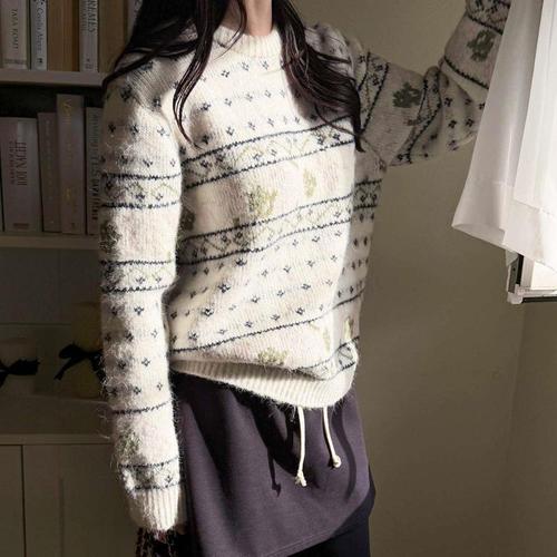 [다잇템]여자 빅사이즈 U넥 패턴 크림색 울 혼방 니트