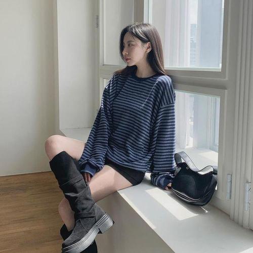 [다잇템]여성 줄무늬 키치무드 U넥 빅사이즈 니트